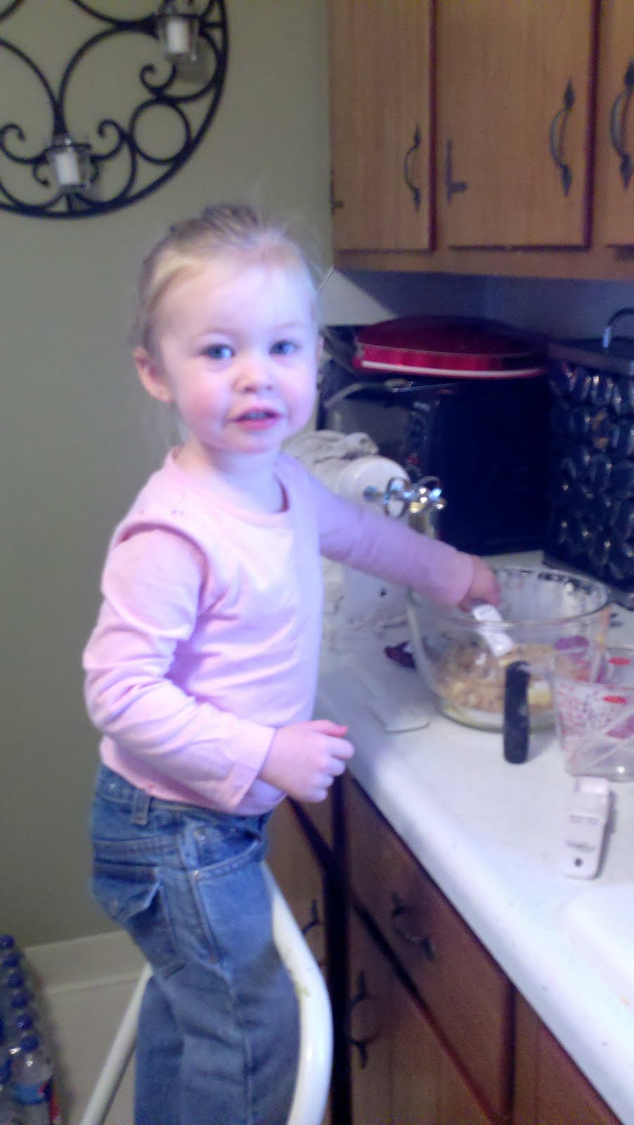 Olivia and I made some chocolate chip cookies today. She was asking if we were going to make them with Grandma, like we did last weekend-I told her that she was at home & she said "I miss her". I agree-6 hours is just too far :( But-I was hoping to bring some of the cookies to daycare tomorrow, but every time I turned around to get something out of the fridge, she had a handful of flour or sugar in her mouth. She loved taste testing the batter too-just like her dad-couldn't keep her hands out of it. So not only was I not able to make as many cookies as I should have been able to, but her little fingers were all over in the batter. I think we'll just keep them for the 3 of us :) And the dogs-I'm sure they will get their fair share too.